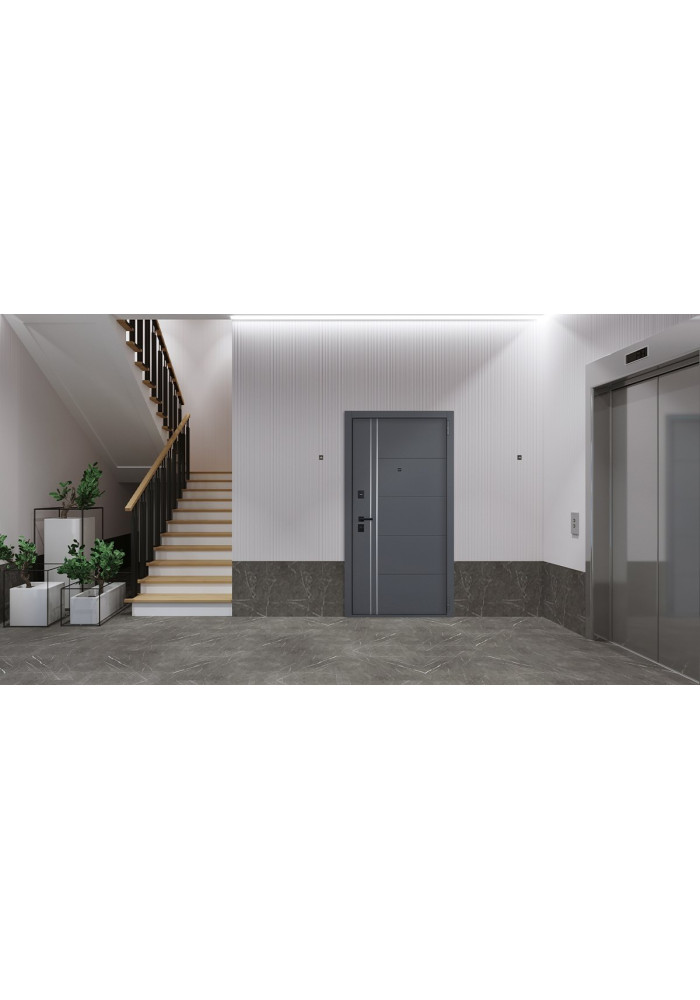 - Наружный лист металла: Лист металла 1 мм. Экошпонированная панель МДФ 10 мм (цвет "бетон темный"). Объемная фрезеровка. Вставки из вертикальных молдингов 2 шт (цвет "матовый хром"). Наличник МДФ гладкий 70 мм.